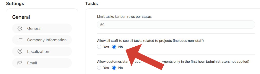 If you want only to show the tasks where the staff member is assigned/added as follower you need to turn off Allow all staff to see all tasks related to projects