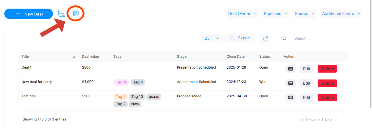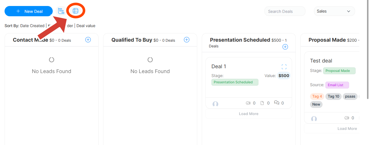 Locate the View Icons – At the top of the page, next to the New Deal (or relevant section) button, you will see one of these icons depending on which layout you're using: