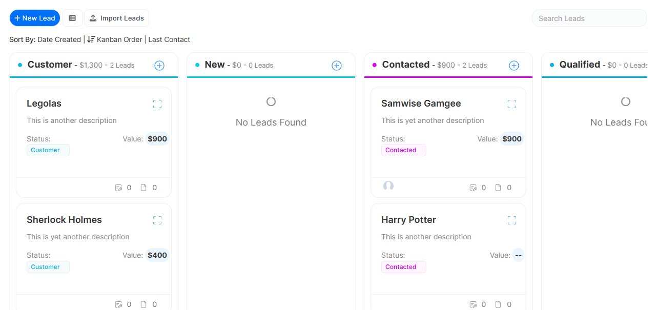 The Kanban view in ClearCRM provides a visual and organized way to manage Leads by categorizing them based on their Status. This layout helps track the progress of each Lead through different stages, ensuring a smooth sales pipeline.