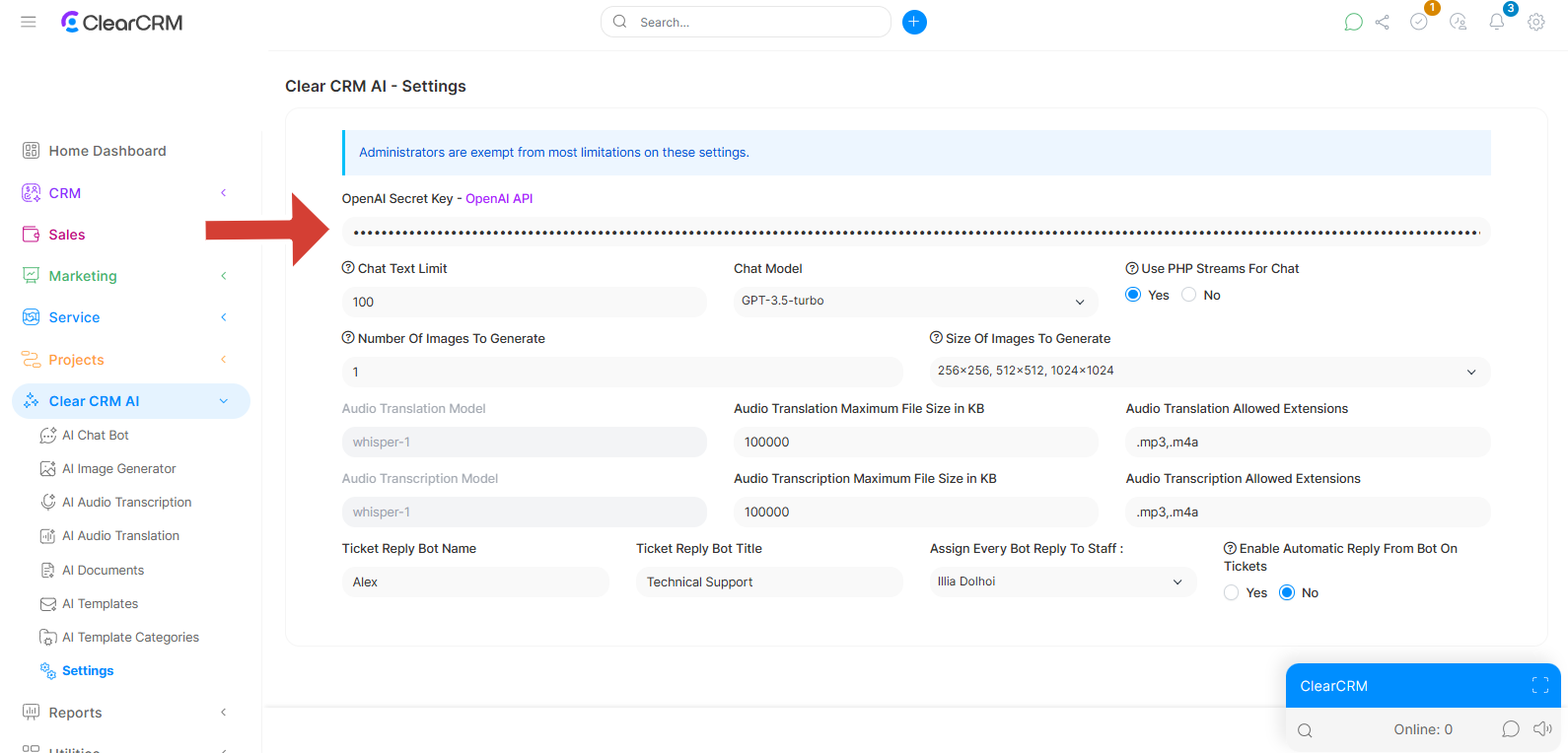 Paste it into the OpenAI Secret Key field in ClearCRM.