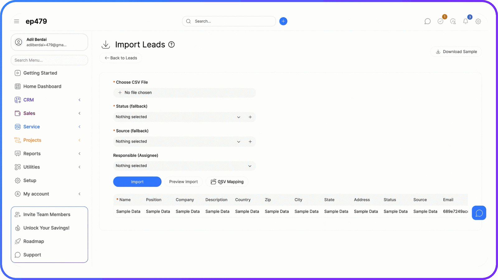 You can upload leads, contacts, customers, and deals in bulk using a CSV file.