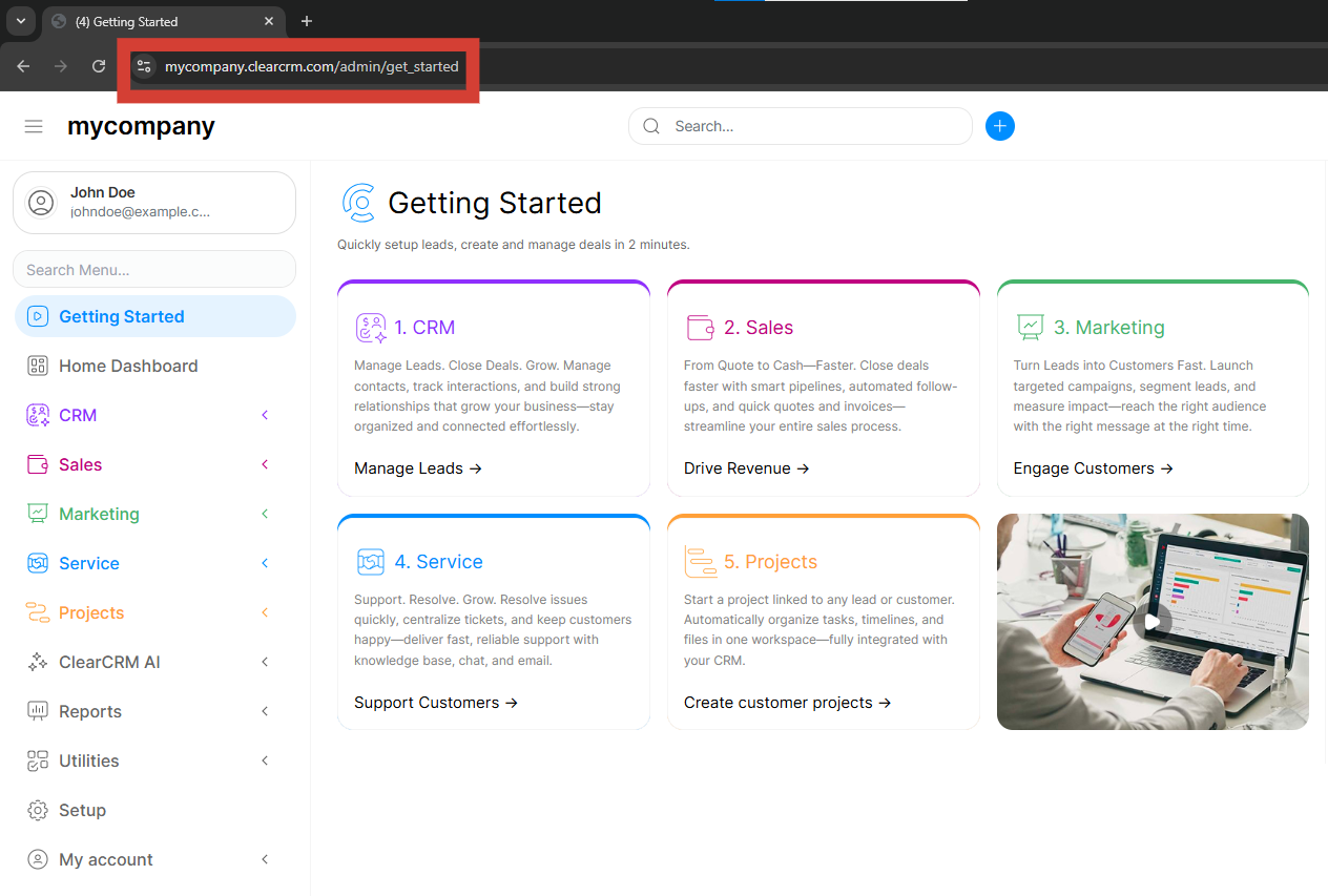 With subdomain: yourcompany.clearcrm.com
